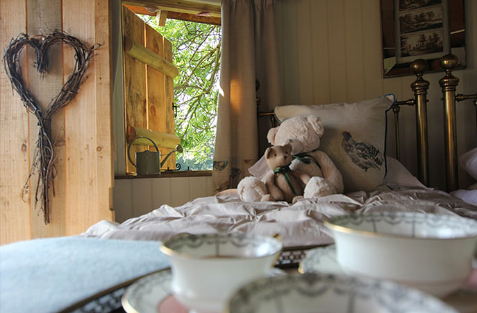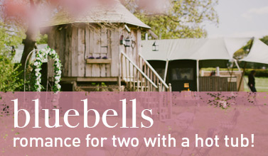 Bluebells is a dreamy place to be together. Nestled against the Spinney wood, this secluded candlelit canvas cottage is designed for two romantics; with its opulent interiors, huge sleigh bed and roll top bath. It comes with its own little treehouse, Bluebell’s Nest, for a cosy night amongst the branches.